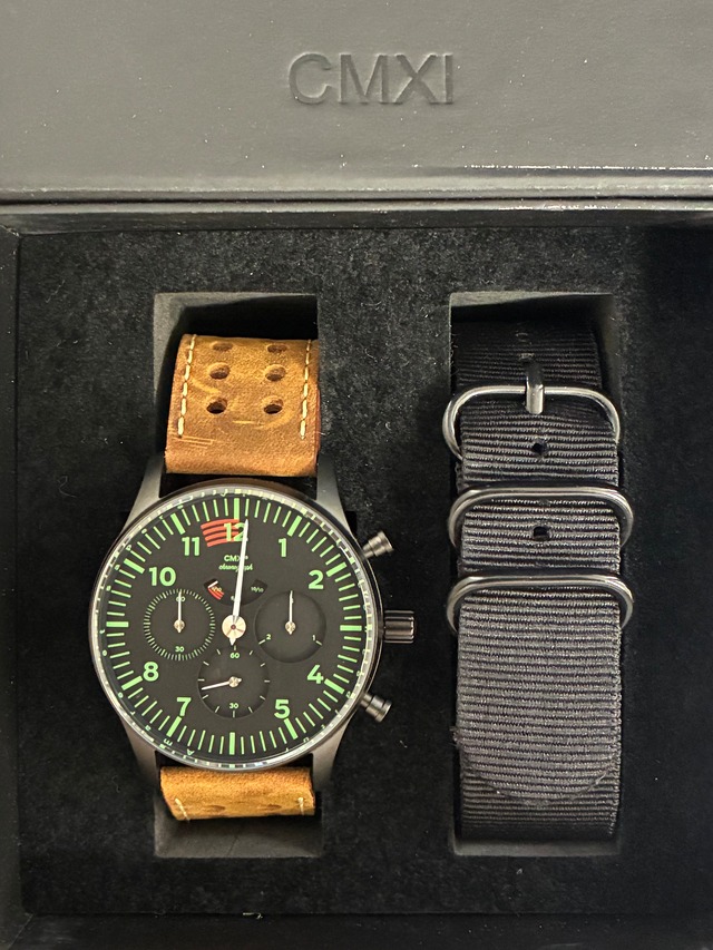 【共通スペック】 -ケースサイズ 45㎜ ‐サファイアクリスタルガラス ‐日本製クォーツムーブメント ‐イタリアンレザーストラップ ‐PVDコーティング -3気圧防水(3ATM) 画像参照3P クラシックスポーツカー愛好家の心をくすぐるディテールの数々が、CMXIウォッチの随所に見ることができます。 ①レブカウンターのレッドゾーンをイメージした12時位置の赤い配色。 ②クルマのメーターにこだわり、分針を廃した1本針機能。 ③実車のメーターデザインを再現した、針止めのビス。 ④オイルゲージを模した特徴的な扇型メーター。 ⑤ブラックの塗装が施されたステアリングコラムの外観とマッチした、マットブラックPVD加工の精悍なケース。 ⑥ドライビンググローブをイメージしたストラップ。