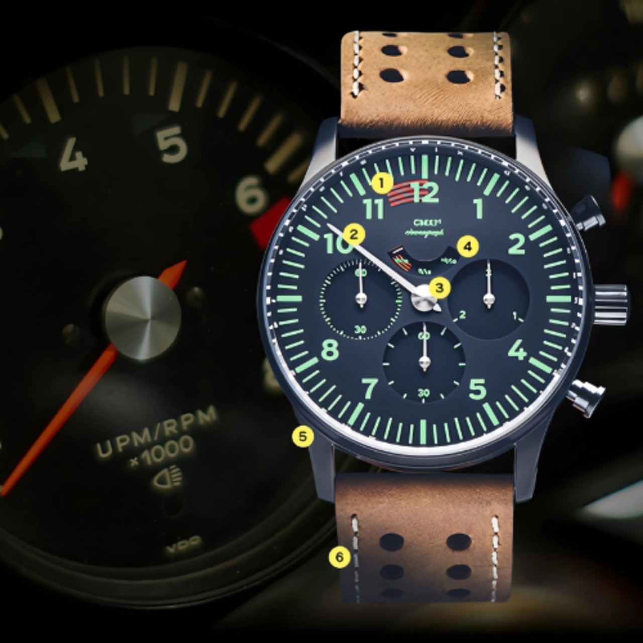 クラシックスポーツカー愛好家の心をくすぐるディテールの数々が、CMXIウォッチの随所に見ることができます。